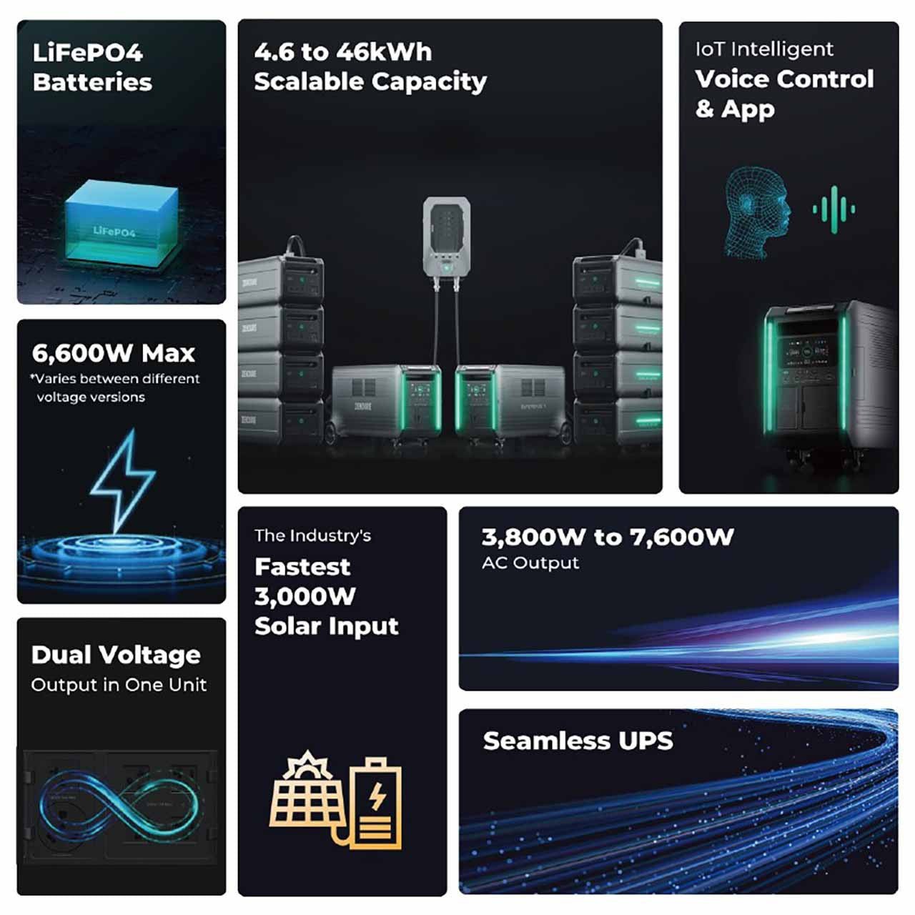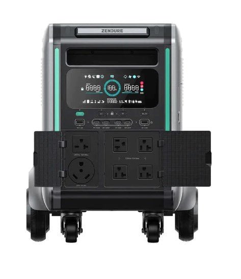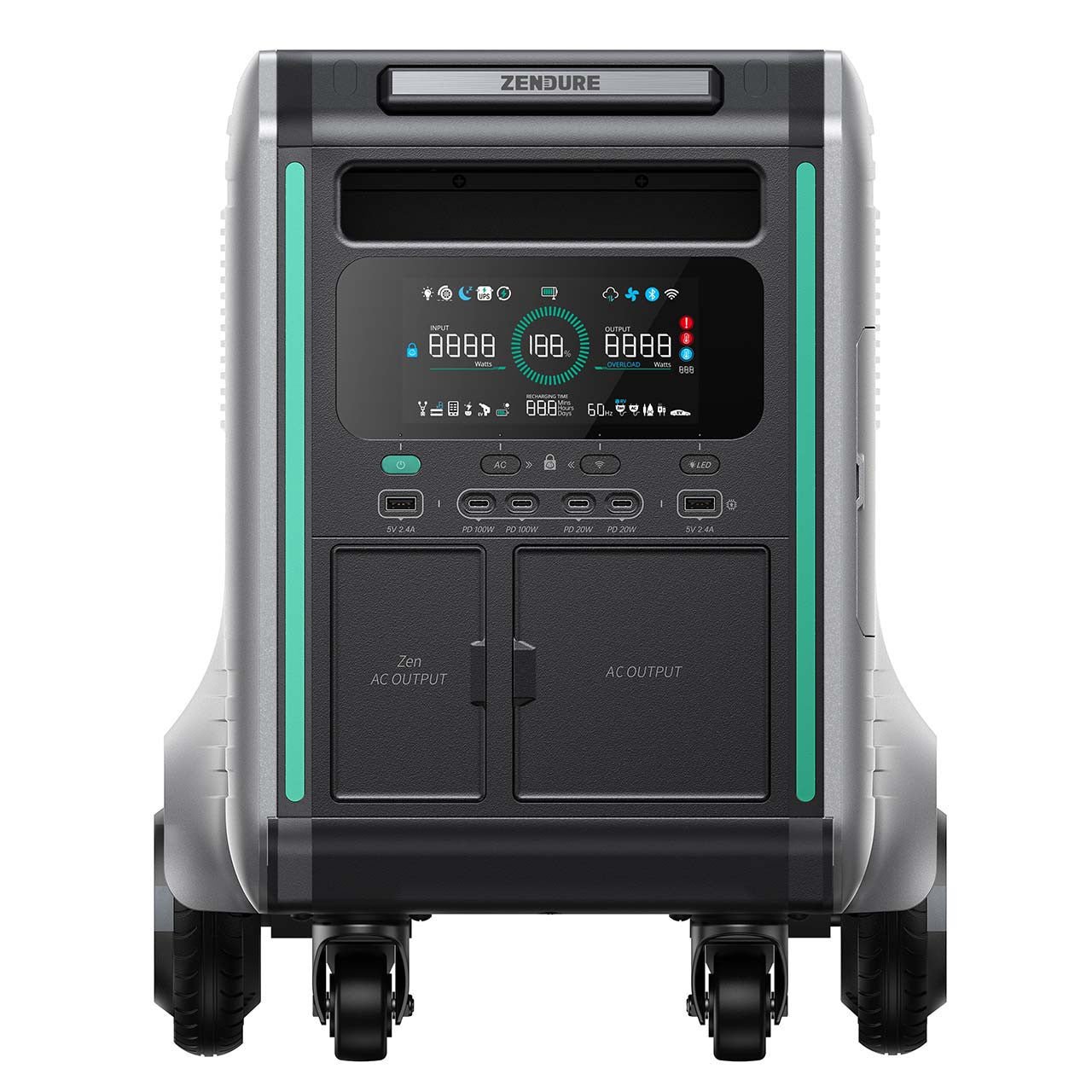 Combining AC and solar power, SuperBase V can charge up to 5,150W on its own, or 6,600W when connected to a Satellite Battery. Whether you’re planning for an emergency or using SuperBase V to manage your household energy consumption, faster is always better.SuperBase V can charge up to 3,000 W using solar power alone. This is enough to fully charge the main unit in 2 to 3 hours. While we offer our own solar panels, SuperBase V is compatible with a wide range of other manufacturers’ solar panels from 12V to 150V and can be easily integrated into your existing solar system. You can charge SuperBase V from a 120V or 240V outlet AC. At 240V, SuperBase V can draw 3,600W at its AC input and recharge in about 2 hours.